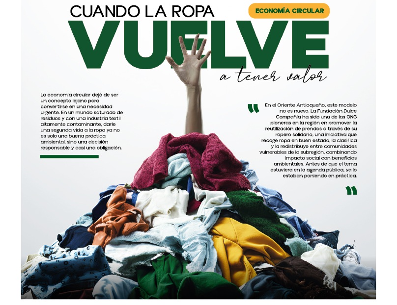 En el Oriente Antioqueño, este modelo no es nuevo. La Fundación Dulce Compañía ha sido una de las ONG pioneras en la región en promover la reutilización de prendas a través de su ropero solidario, una iniciativa que recoge ropa en buen estado, la clasifica y la redistribuye entre comunidades vulnerables de la subregión, combinando impacto social con beneficios ambientales. Antes de que el tema estuviera en la agenda pública, ya lo estaban poniendo en práctica.